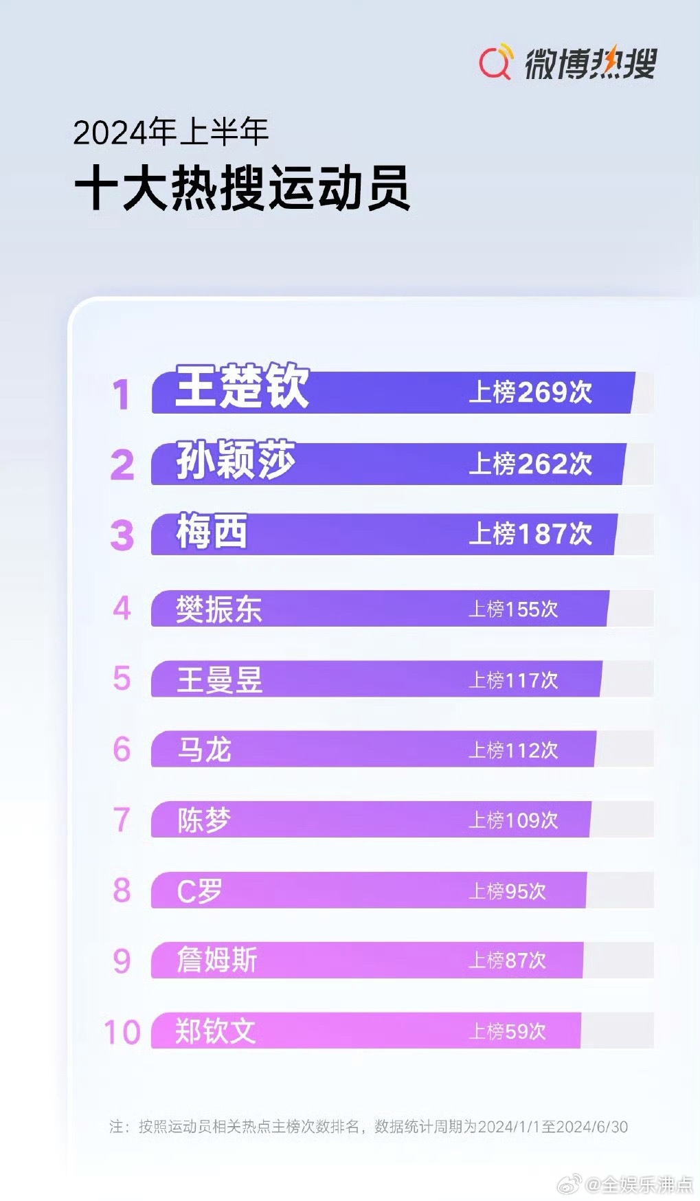 金年会体育03月01日讯 微博热搜发布了2024年全年的十大热搜体育运动员,其中乒乓球运动员占了7席,另外3人为网球郑钦文,跳水全红婵,游泳潘展乐。足球和篮球运动员则是无人上榜。
