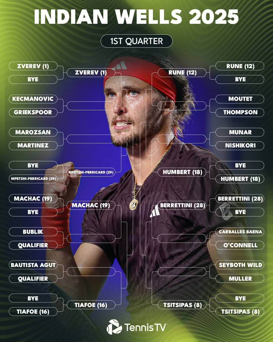 金年会体育四分之二区由鲁德领衔,去年赛会亚军梅总同样在这个区。其他种子球员还有保罗、穆塞蒂、菲斯、米歇尔森、波普林和莱赫卡。该区目前排名位居前列但还未取得大师赛冠军的还大有人在,按照印第安维尔斯大师赛近年来有诞生新大师的惯例,保罗、鲁德和穆塞蒂等都有望冲一冲。我国两位球员张之臻和布云朝克特也被分在这个区,按照两人目前的状态,能拿到一场胜利也已经是谢天谢地了。